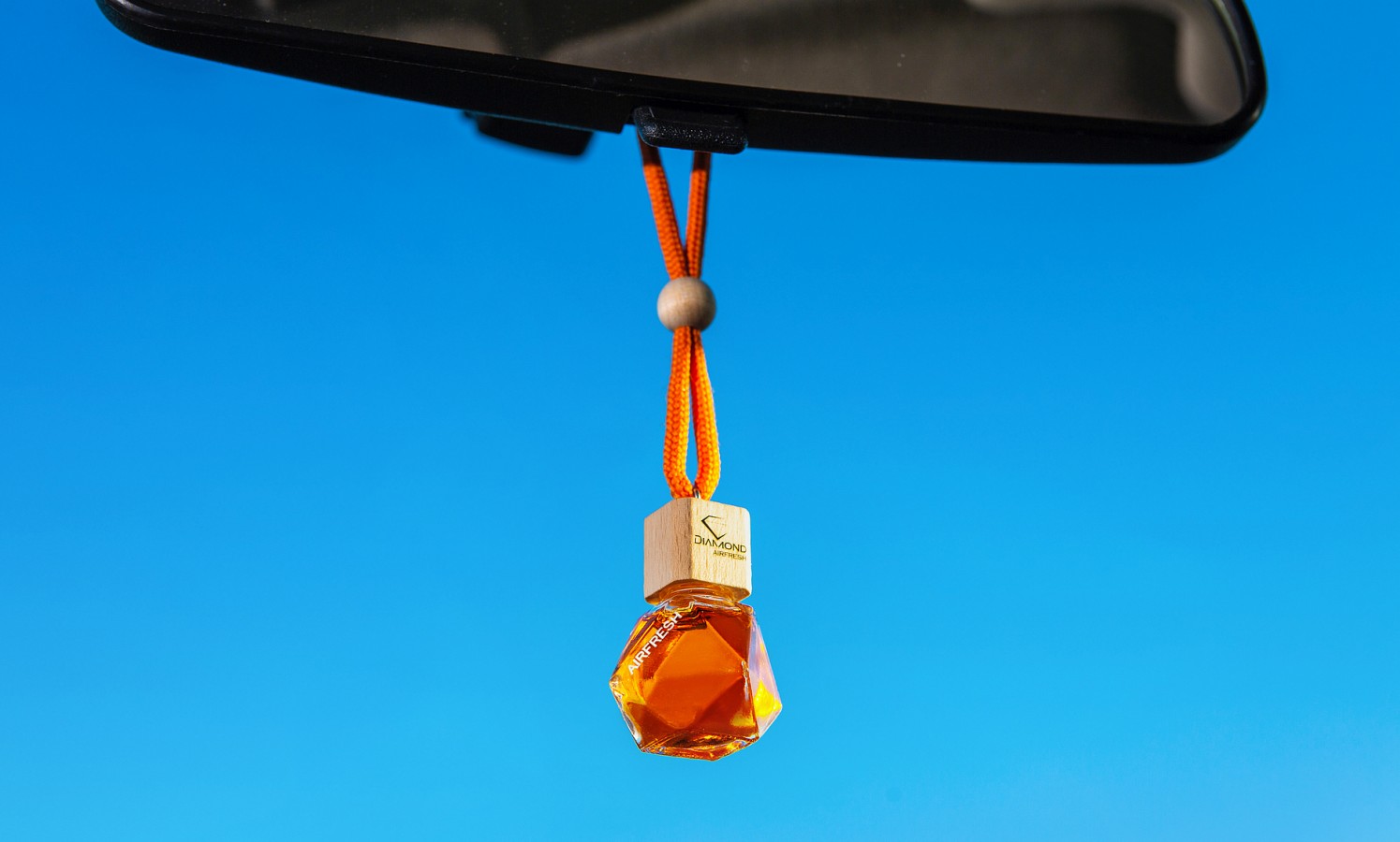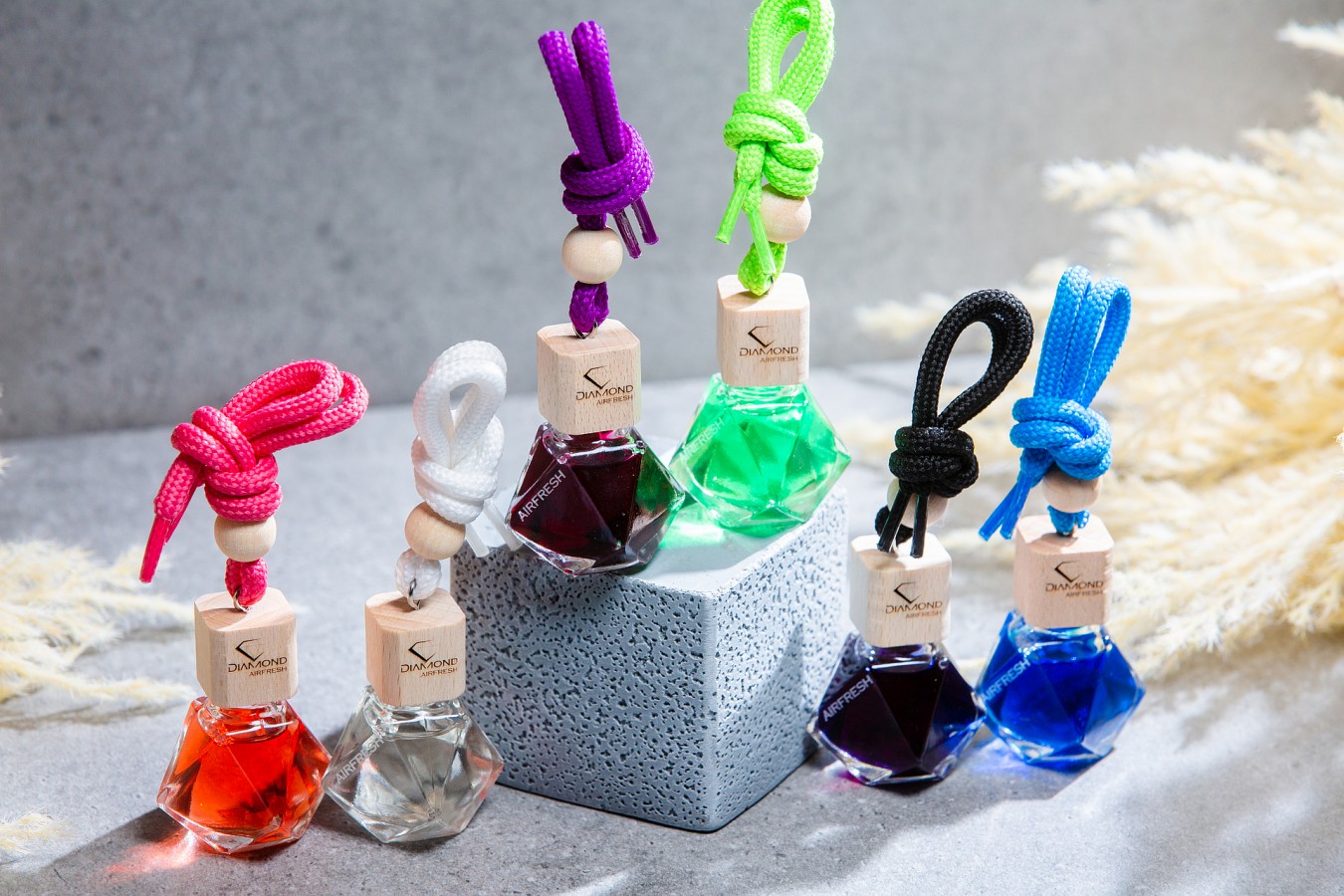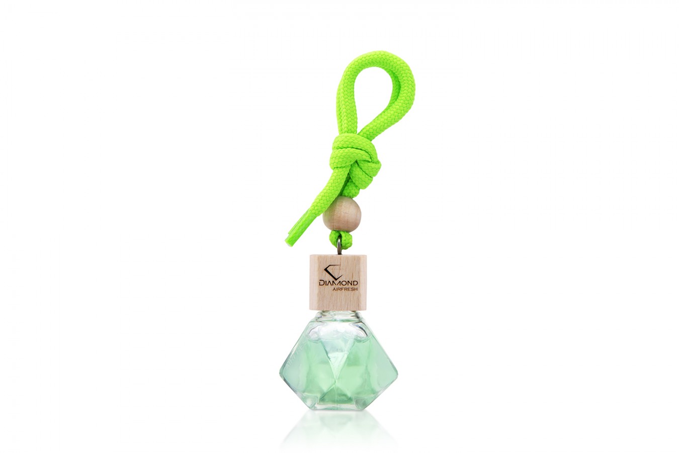Wählen Sie Ihren Autoduft in einer Glasflasche in Form eines Diamanten.