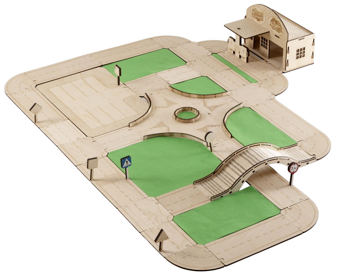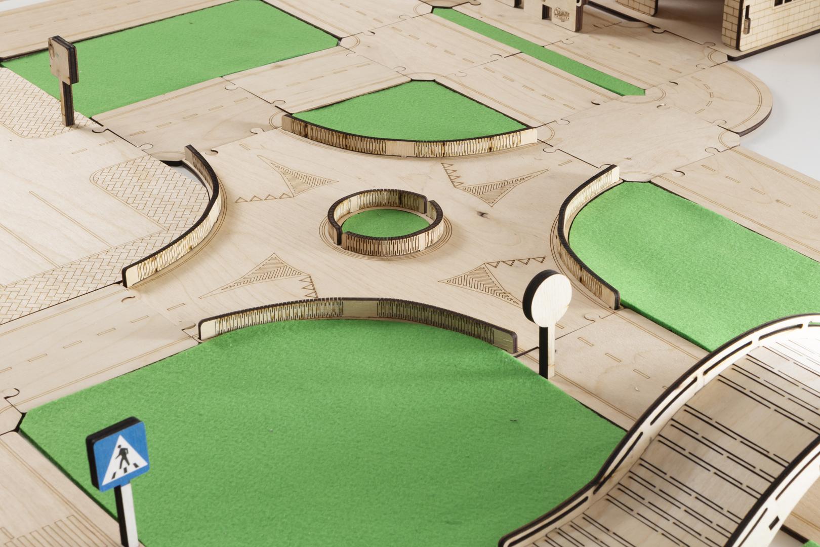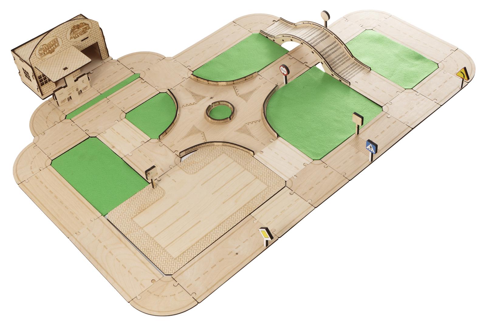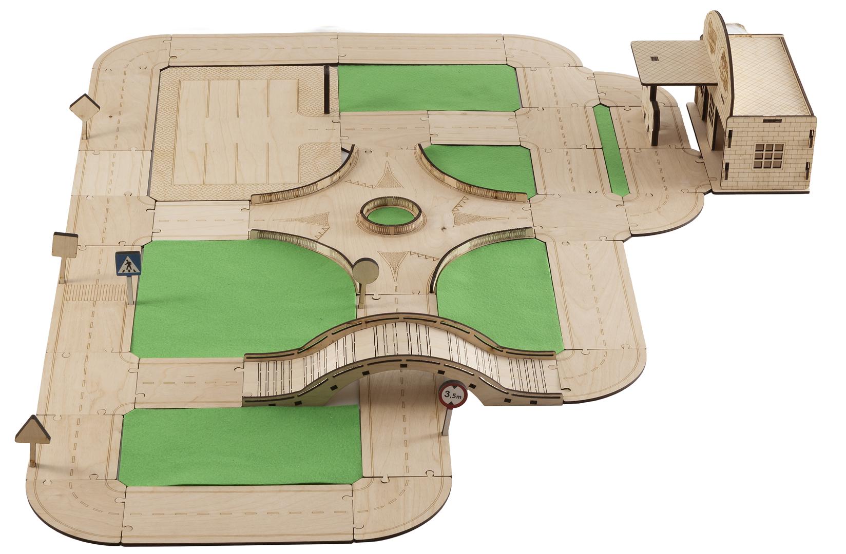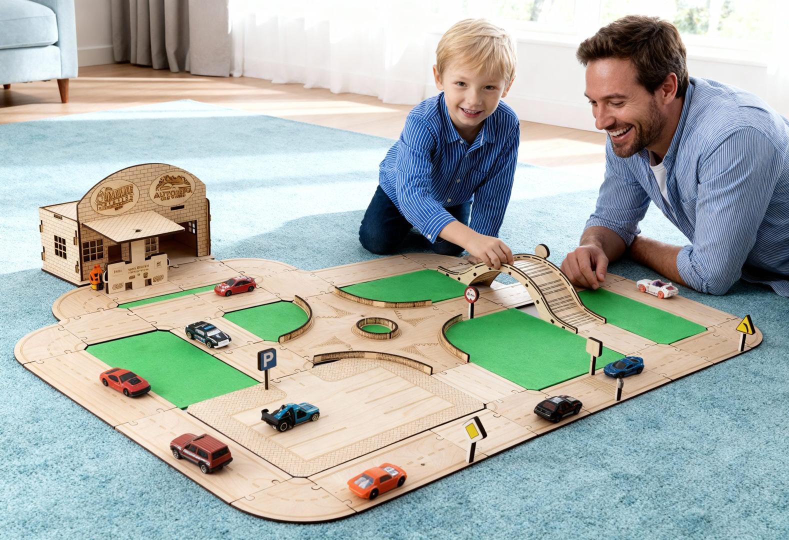 Drewniany tor modułowy „Zbuduj swoje miasto” to zestaw 62 elementów z naturalnej sklejki brzozowej. Dziecko może układać ulice, zakręty, mostki i rondo jak puzzle, tworząc własne miasto. Bez plastiku, bez baterii — trwała, mądra i bezpieczna zabawka dla dzieci 3+.