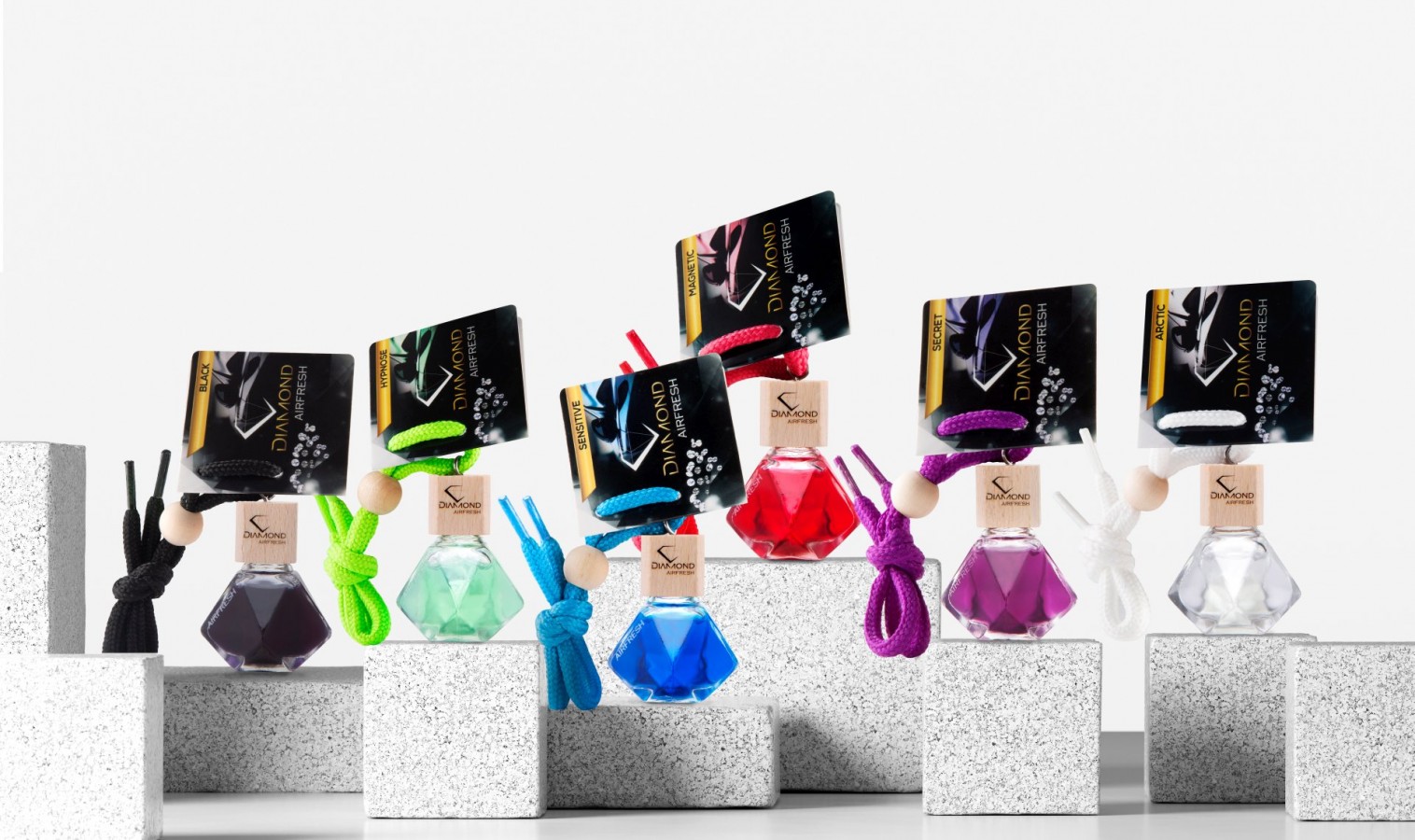 An exclusive collection of car fragrances, distinguished by their unique design. Diamond-shaped bottles, intense colours and selected fragrances create an atmosphere of luxury and elegance that lasts for many weeks.