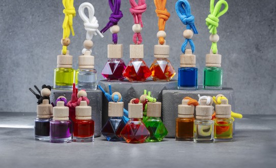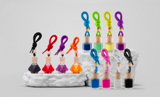 The minimalist shape of the air freshener and the fragrance composition visible through the glass of the bottle