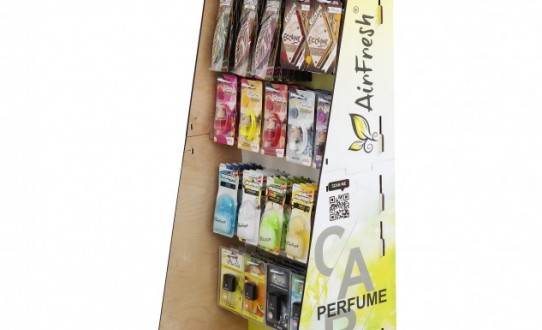 We personalize the displays according to the customer's requirements. We are able to make a display with individual graphics, logos and in colors that the customer personally chooses. Any products can be presented on the displays, hung on hooks (as in the photo).
