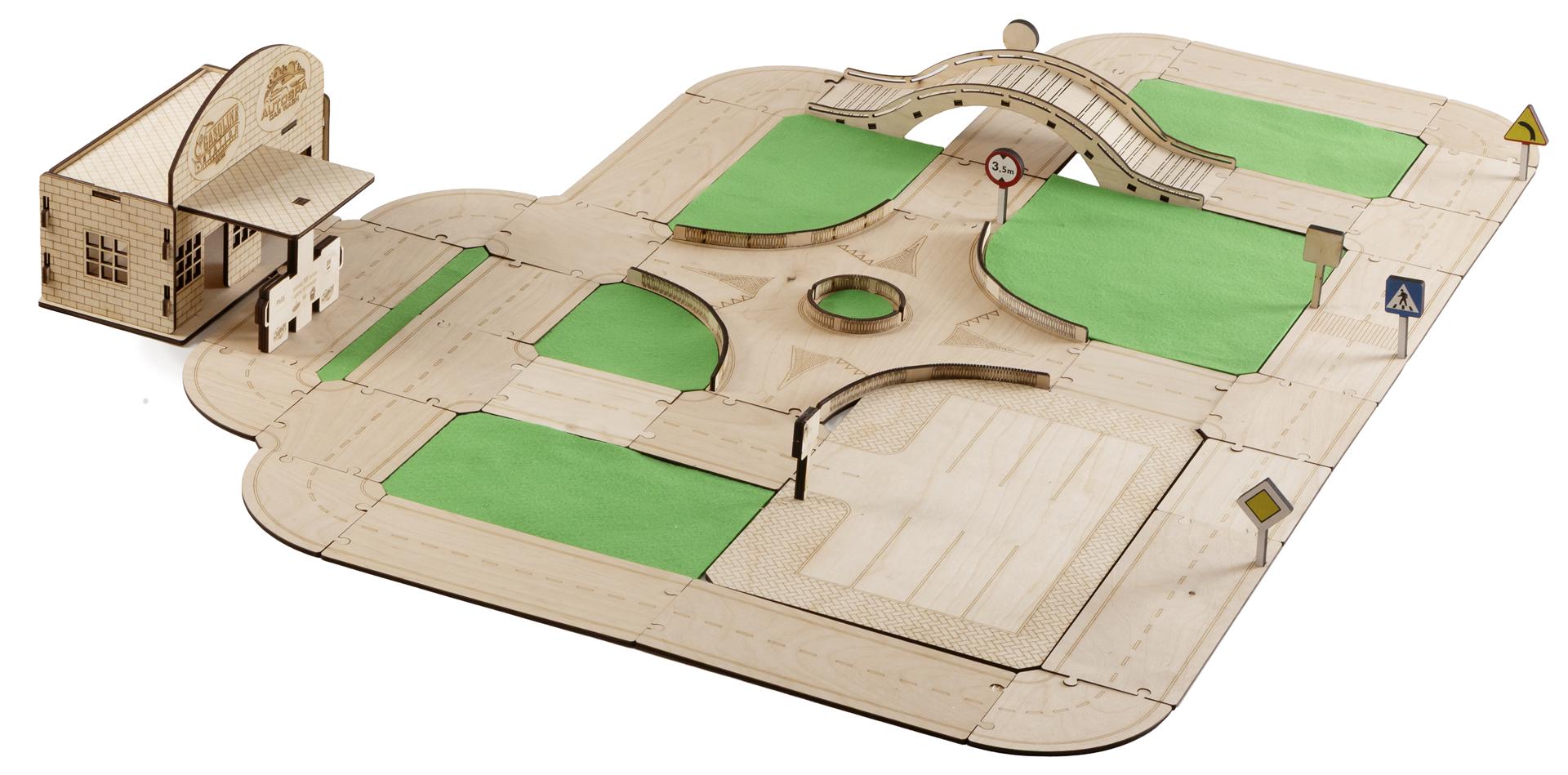 Drewniany tor modułowy „Zbuduj swoje miasto” – 62 elementy