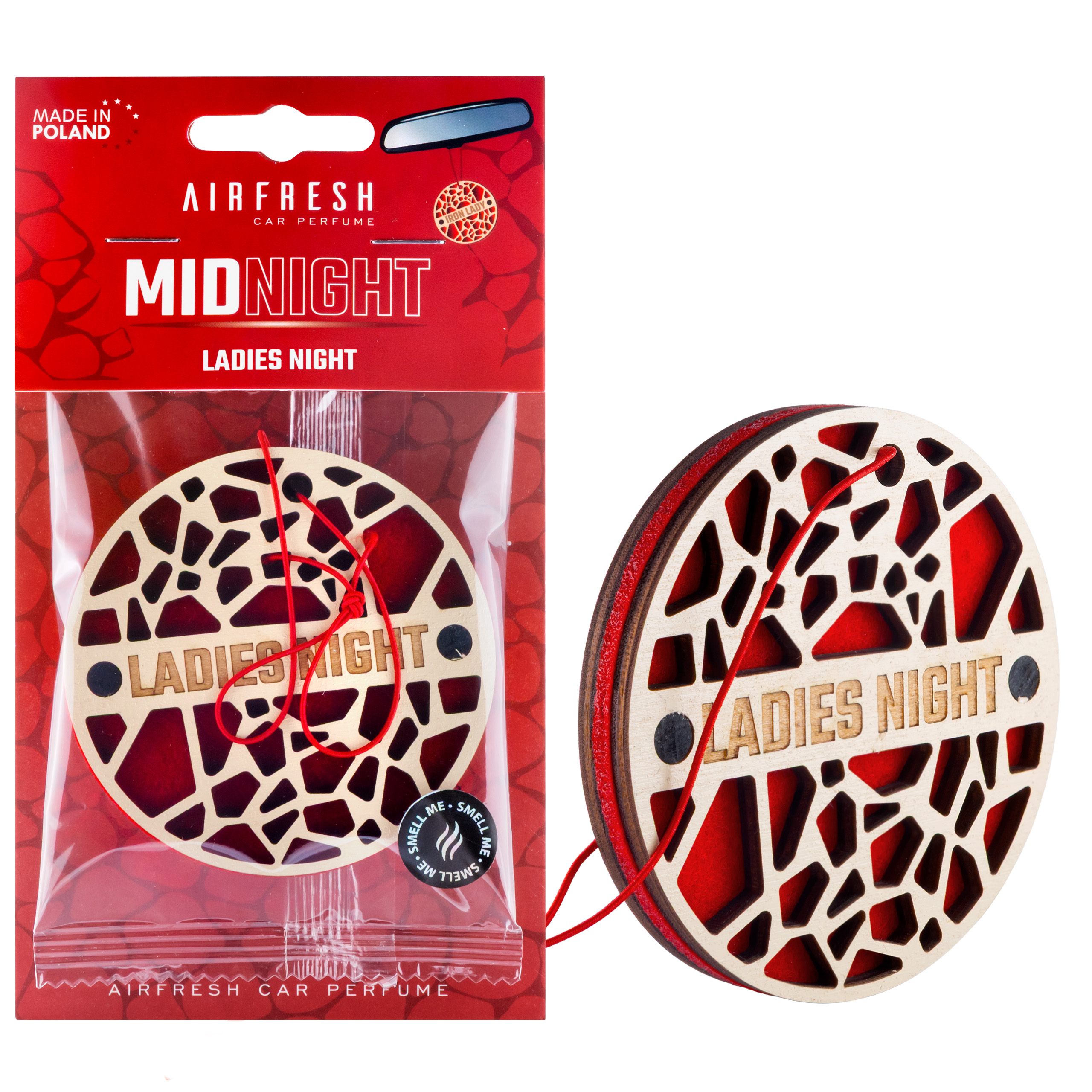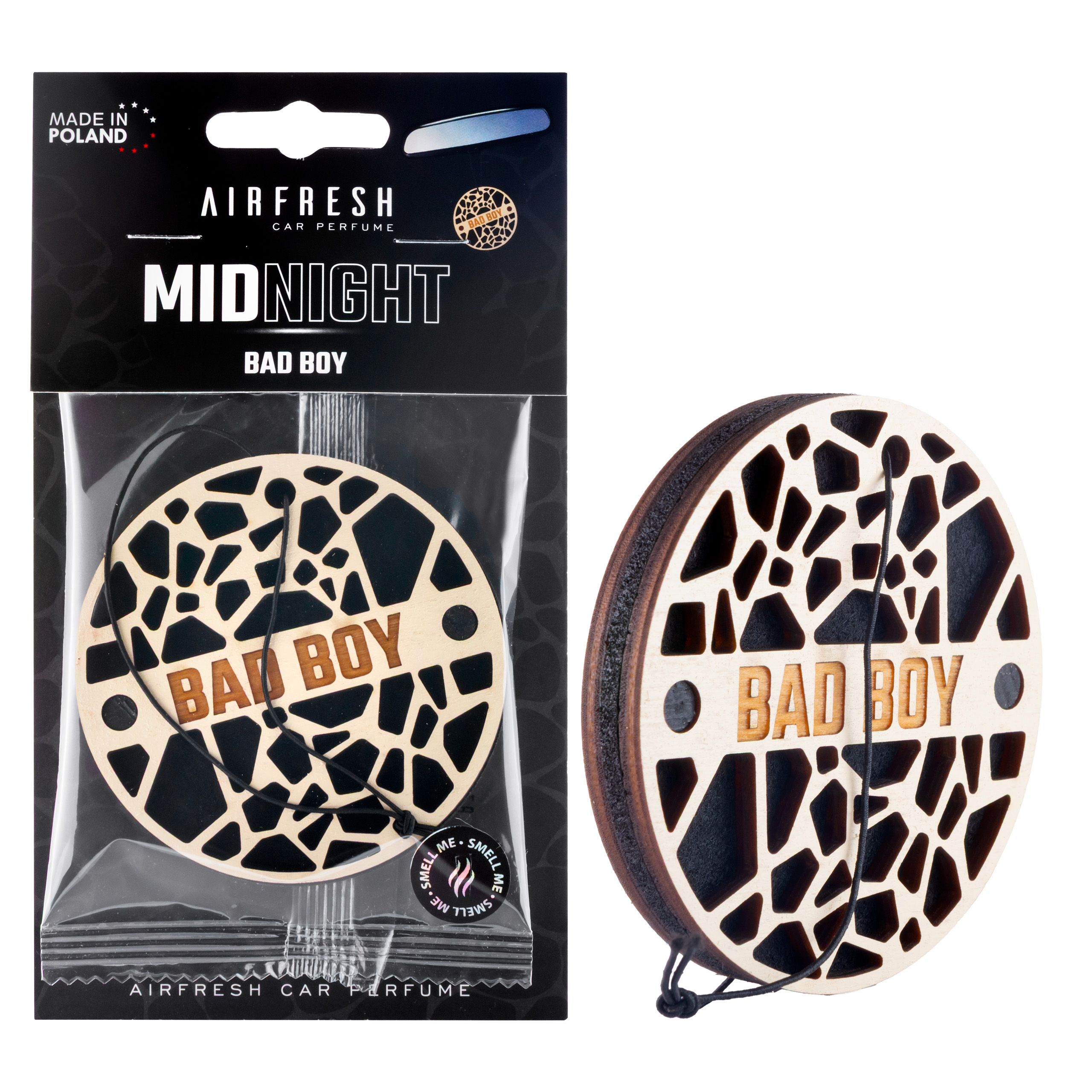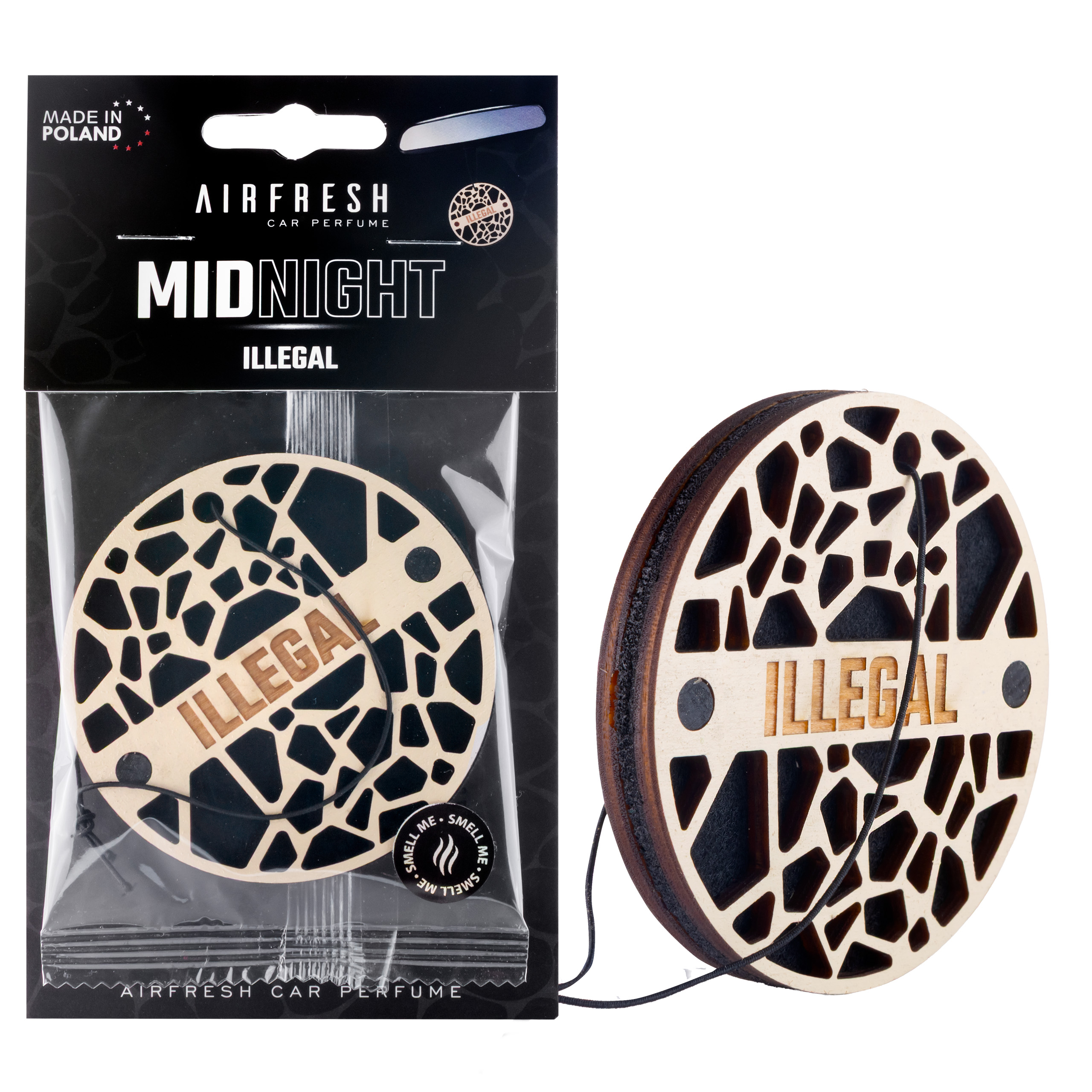 Ażurowo wycinany front z drewna tworzy efekt premium już przy pierwszym kontakcie z produktem. Filc pełni rolę nośnika zapachu, dzięki czemu aromat uwalnia się bardziej stabilnie i dłużej, zamiast dawać mocne uderzenie tylko na początku użytkowania. W efekcie MIDNIGHT działa nie tylko jako zapach do auta, ale również jako estetyczny element wnętrza.