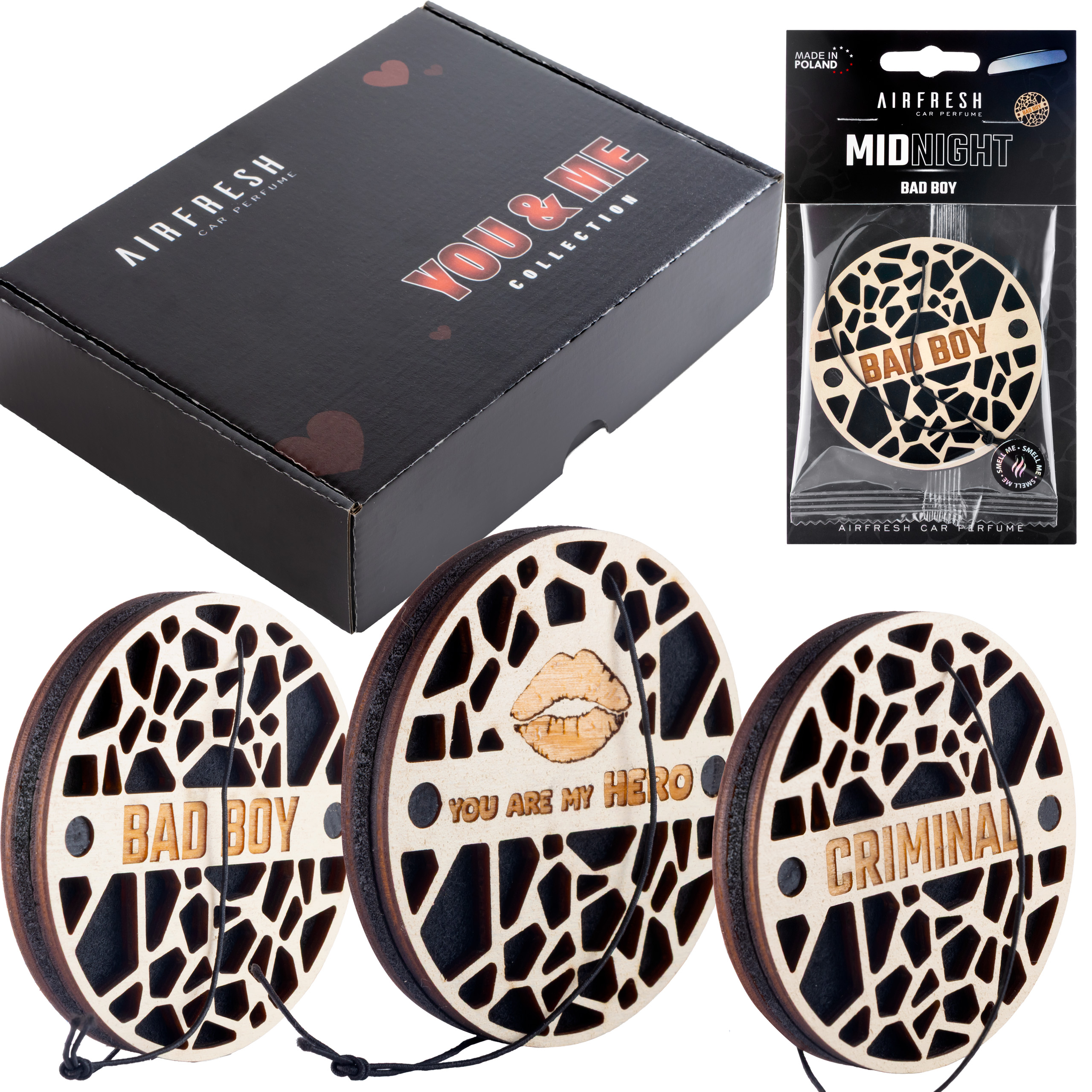 Kolekcja MIDNIGHT to perfumowane zapachy samochodowe premium dla osób, które oczekują od produktu mocnego charakteru, wyrazistego designu i dopracowanej kompozycji. Połączenie naturalnego drewna i filcu zapewnia elegancki wygląd oraz stabilne, długotrwałe uwalnianie aromatu.