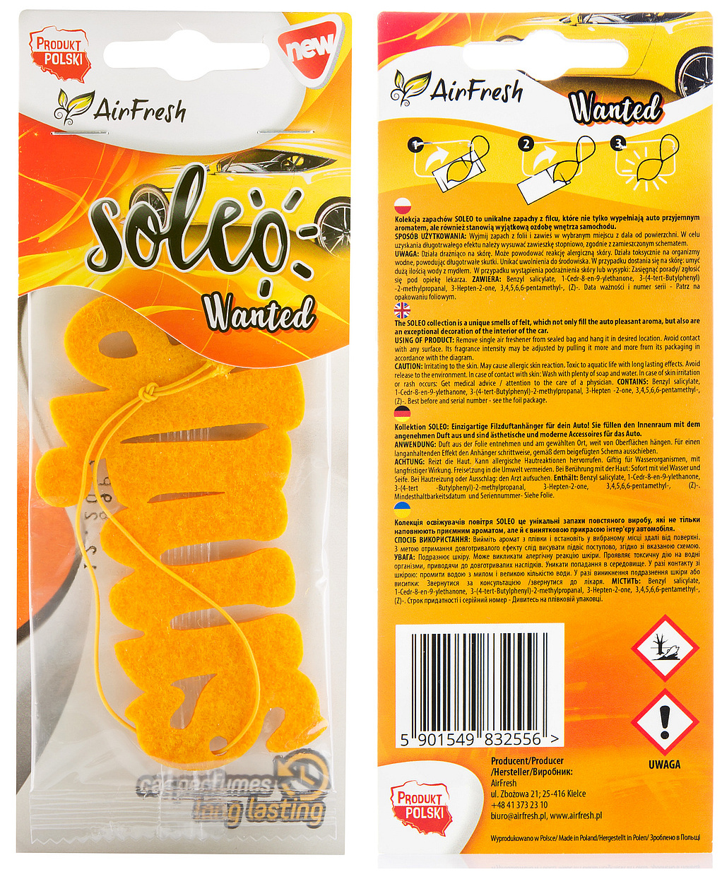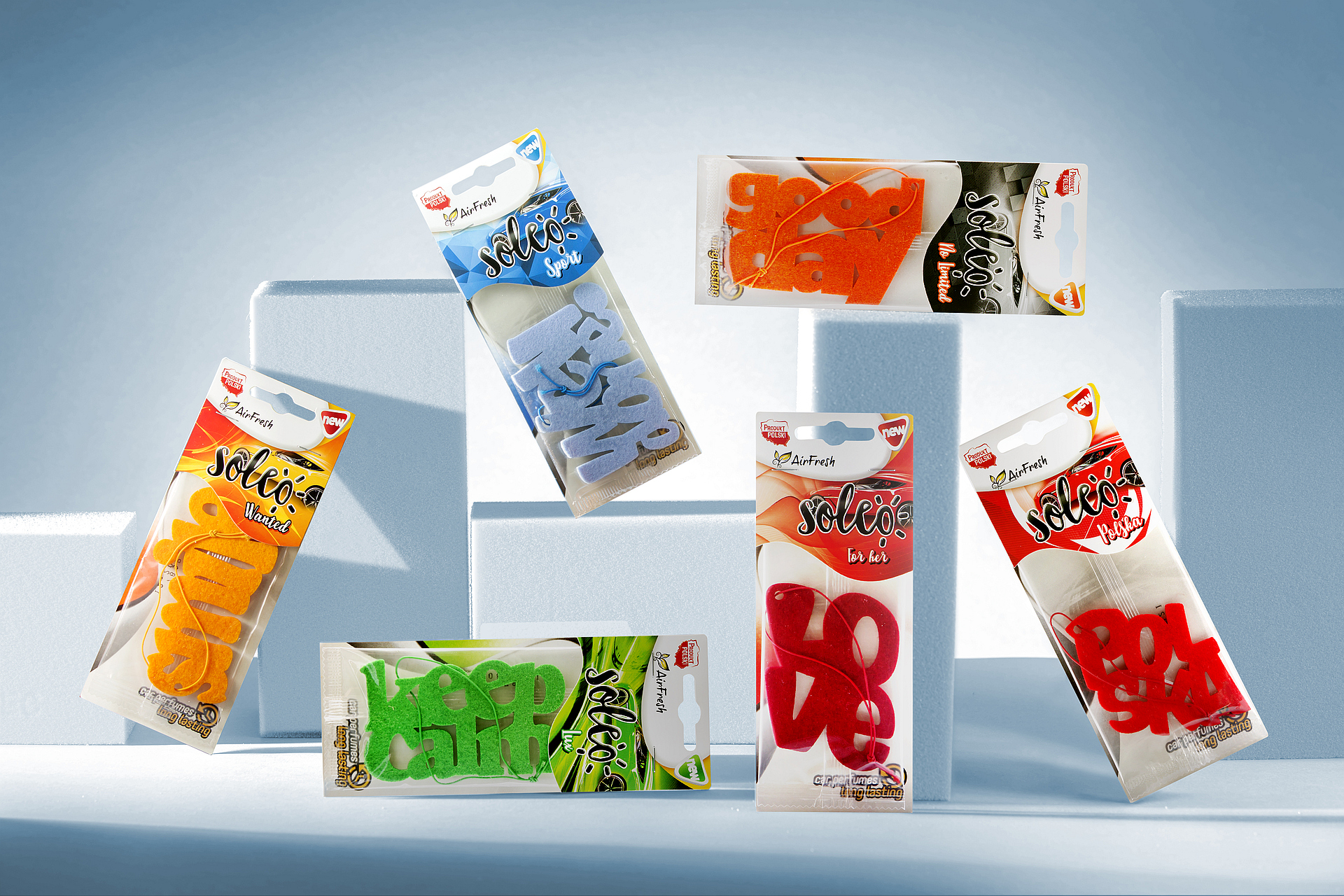 Kolekcja zapachów Soleo to unikalne zapachy z filcu, które wypełniają auto przyjemnym aromatem oraz stanowią dodatkowo wyjątkową ozdobę wnętrza samochodu.
