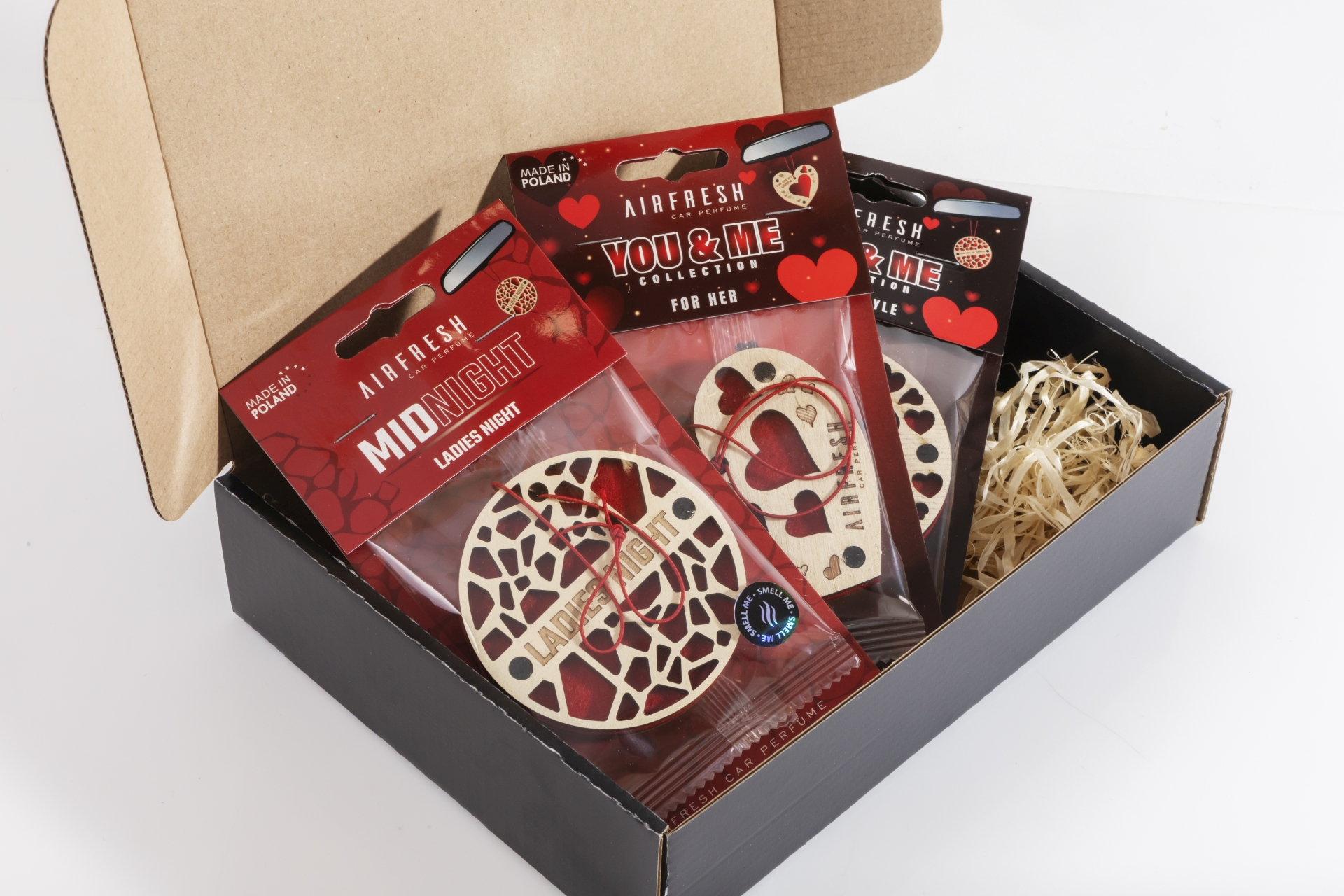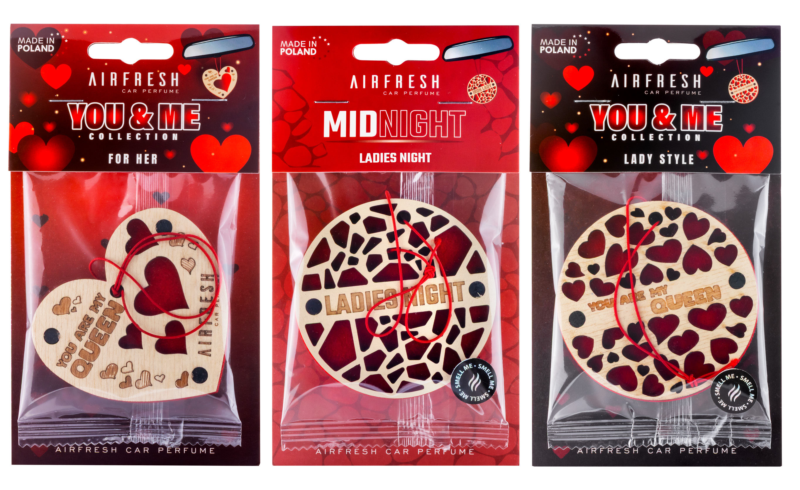 Drewno w połączeniu z czerwonym filcem tworzy wyrazisty design, a perfumowane kompozycje zapewniają długotrwały efekt zapachowy. Zestaw sprawdzi się zarówno w samochodzie, jak i jako zapach do wnętrz.