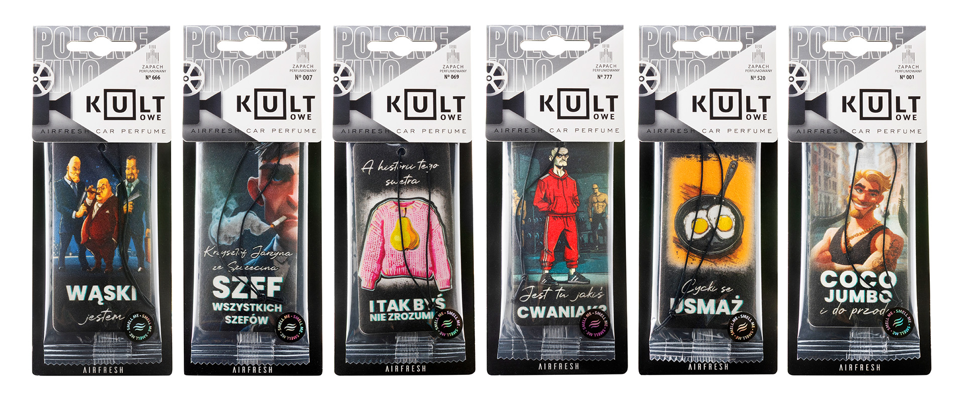 Zestaw perfumowany mixZestaw 6 zawieszek z kolekcji KULTOWE to propozycja dla osób, które chcą poznać pełną linię zapachów inspirowanych perfumami i kultowymi motywami z polskiego kina. To produkt łączący zapach, design i humor w jednej kolekcji.